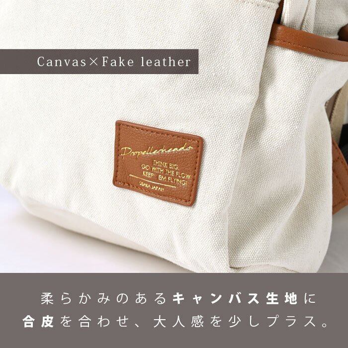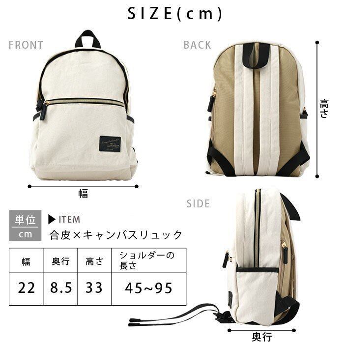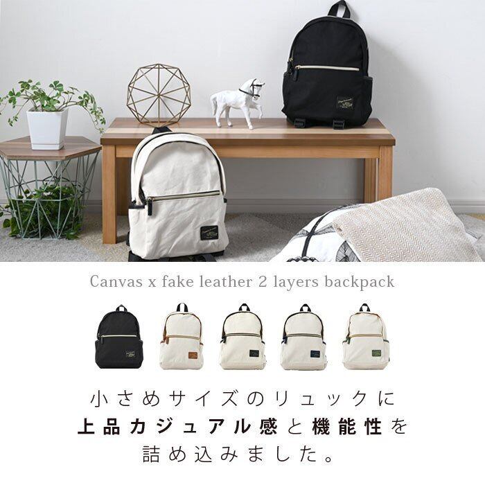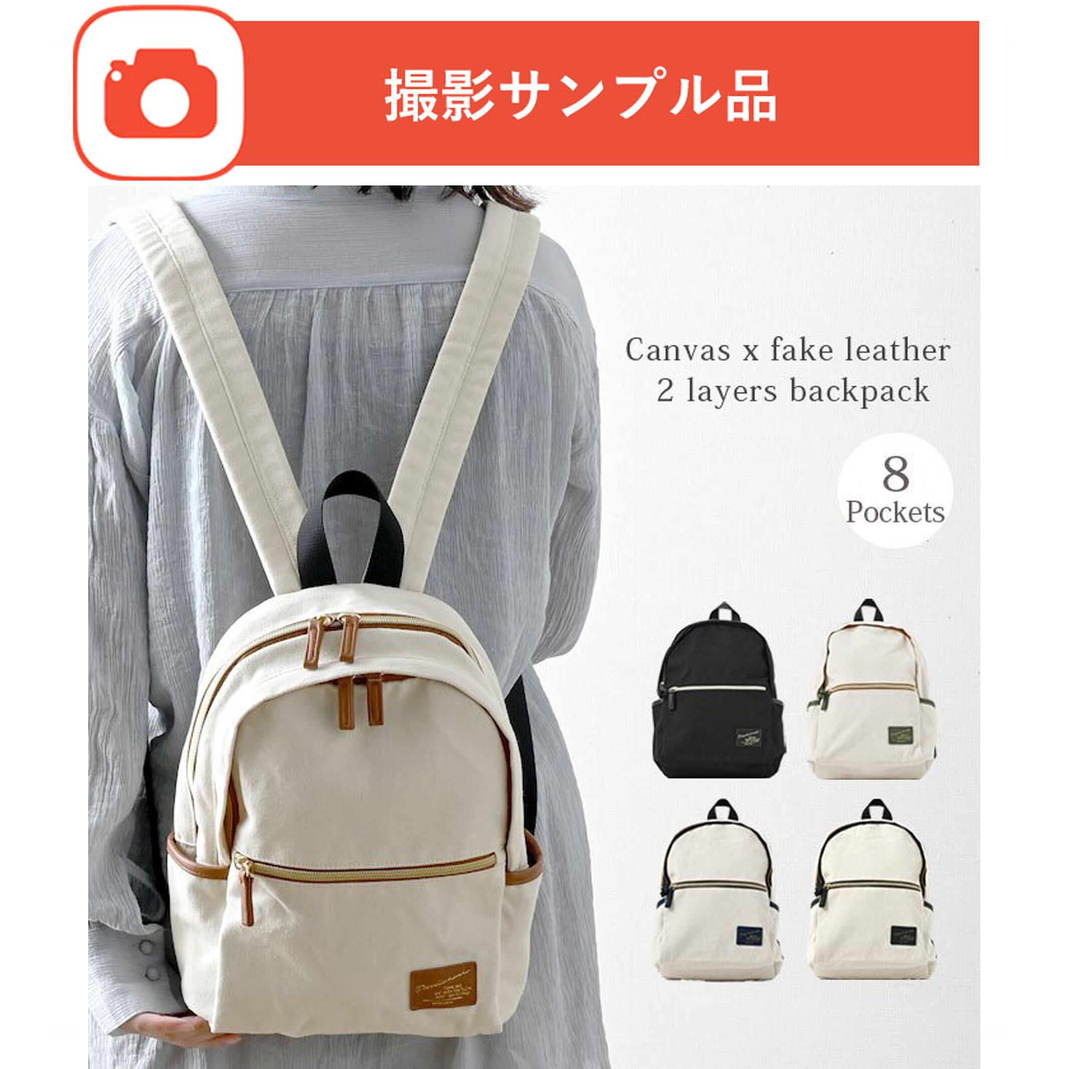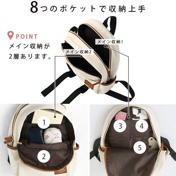 キャンバス×合成皮革 リュック 8ポケット 2層